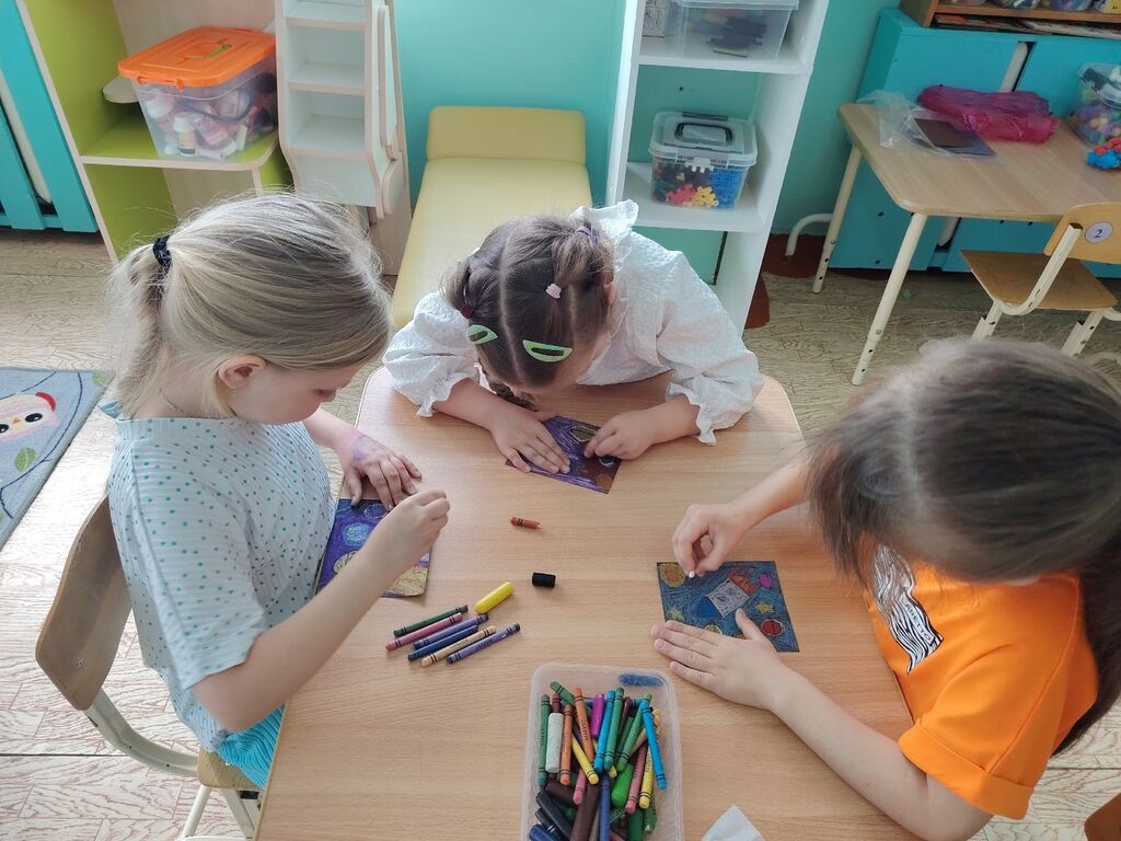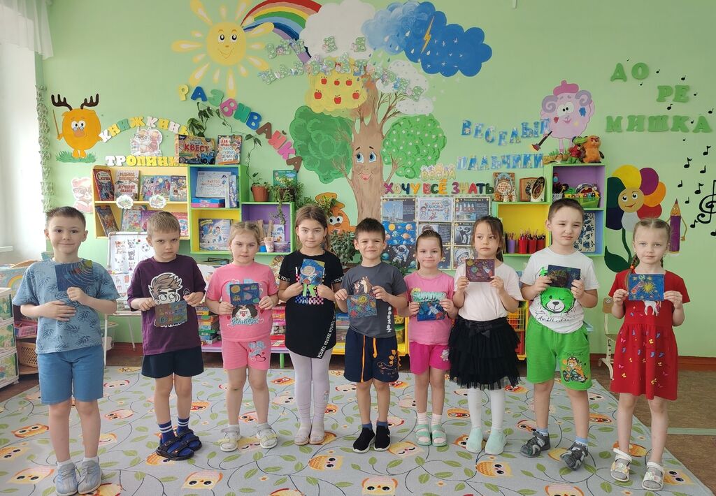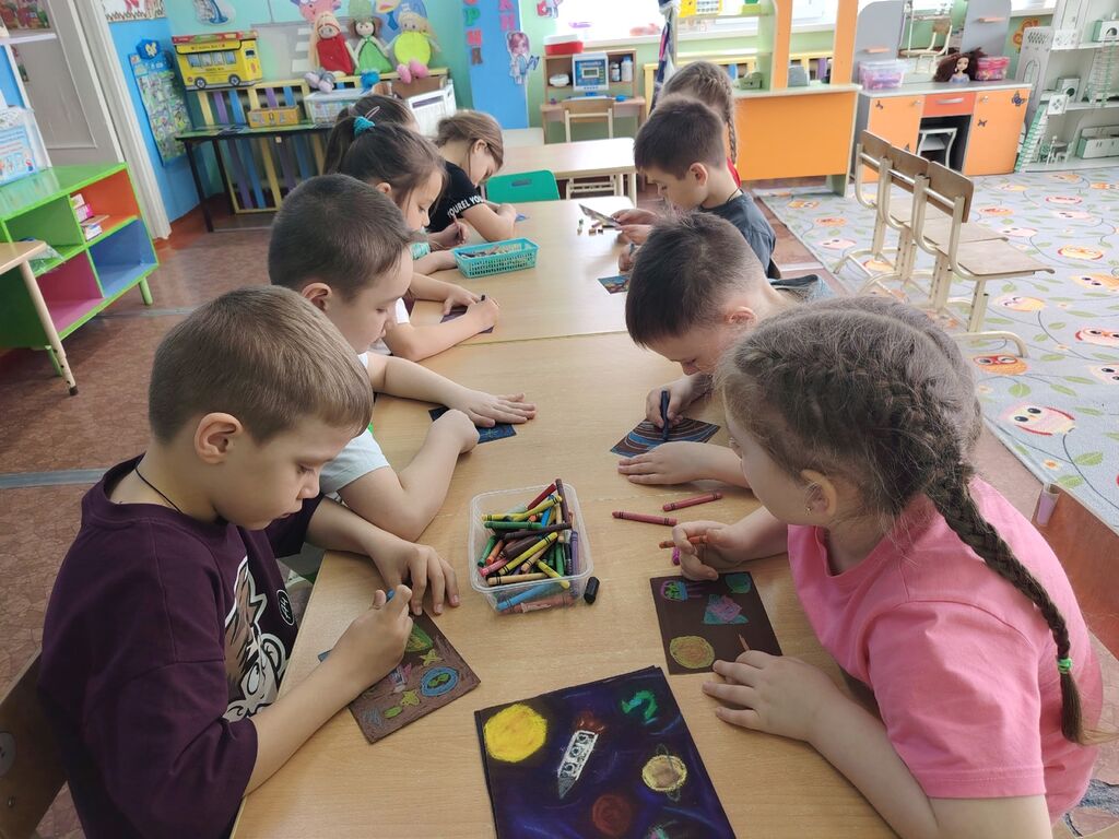 На очередном занятии кружка «Цветные ладошки» дошкольники познакомились с понятием космоса и вспомнили, кто первым отправился в космическое путешествие. В честь Дня космонавтики ребята создали творческие работы под названием «Загадочный космос», используя наждачную бумагу и восковые мелки. Получились очень интересные и оригинальные рисунки.